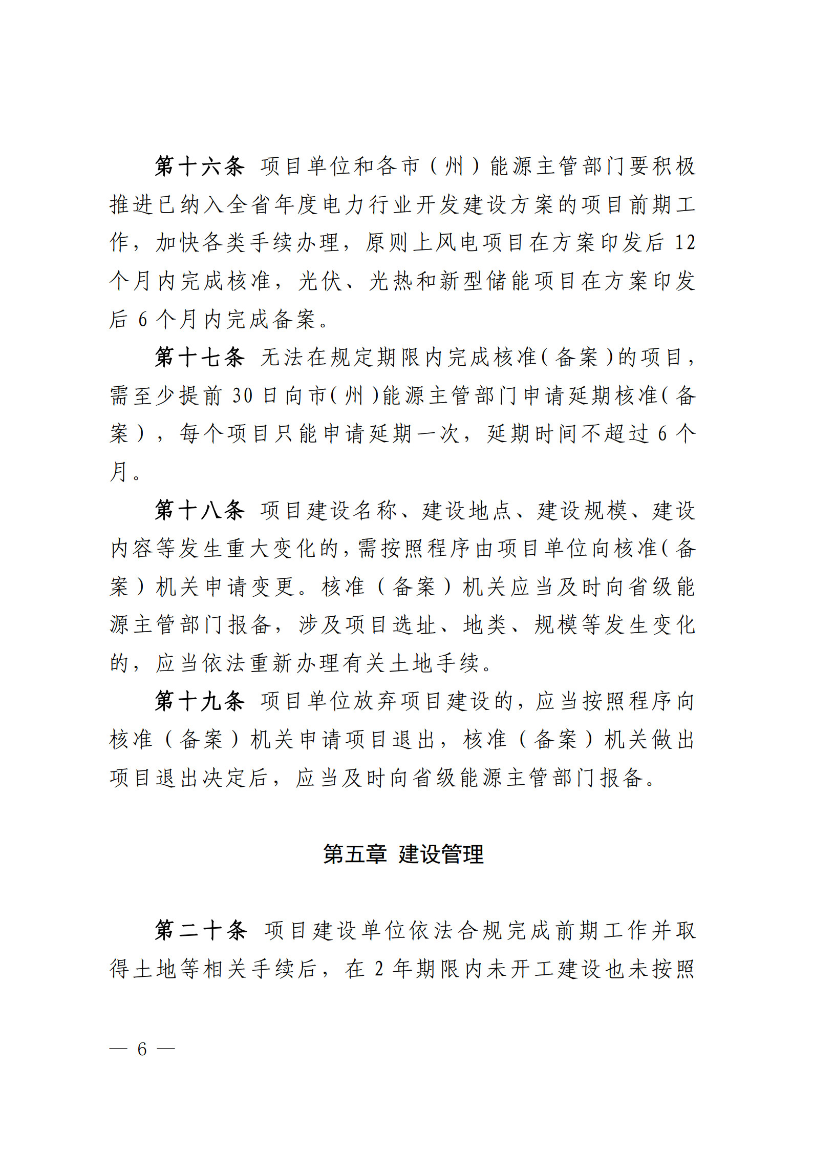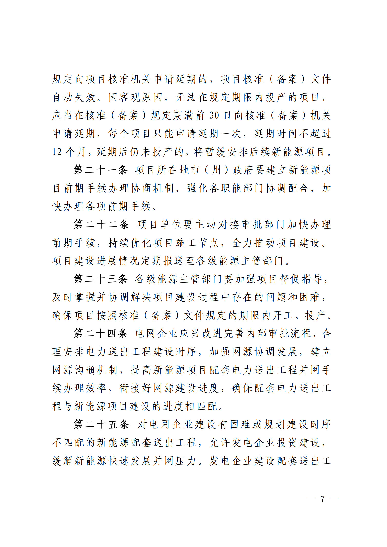项目建设单位应当依法合规完成前期工作并取得土地等相关手续后,在2年期限内未开工建设也未按照规定向项目核准机关申请延期的,项目核准(备案)文件自动失效。因客观原因,无法在规定期限内投产的项目,应当在核准(备案)规定期满前30日向核准(备案)机关申请延期,每个项目只能申请延期一次,延期时间不超过12个月,延期后仍未投产的,将暂缓安排后续新能源项目。