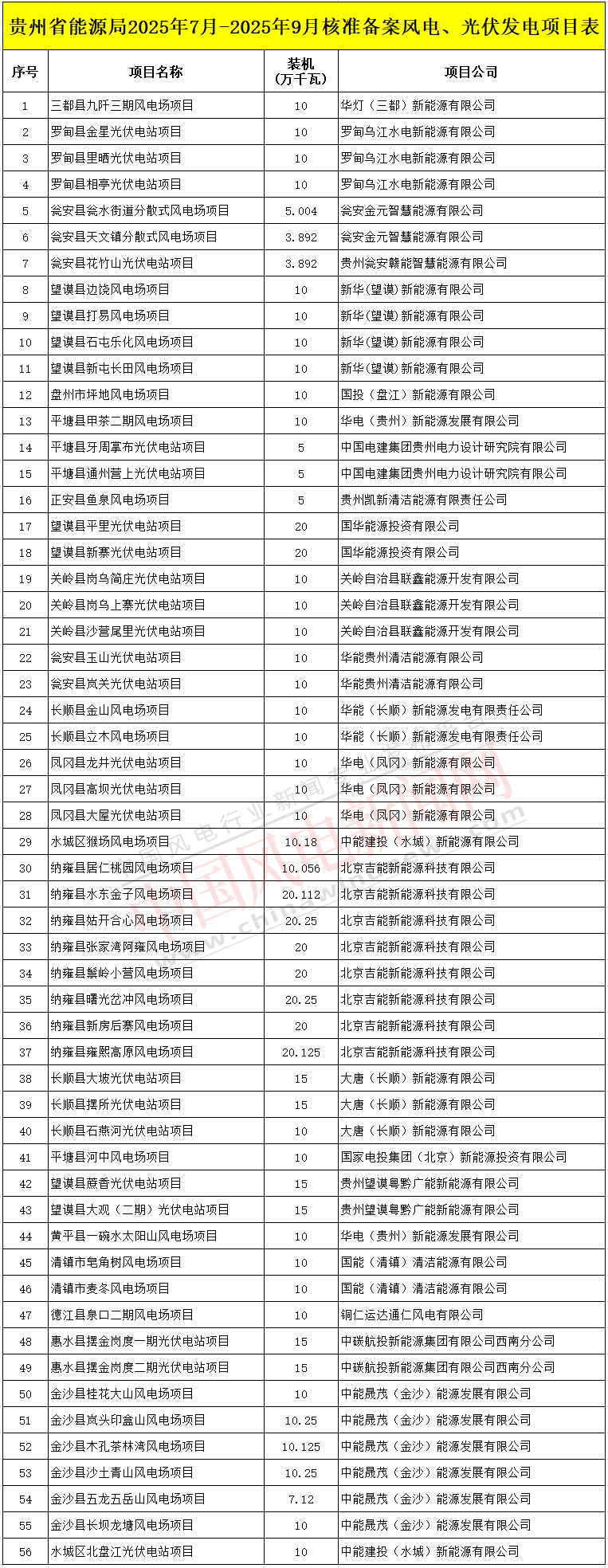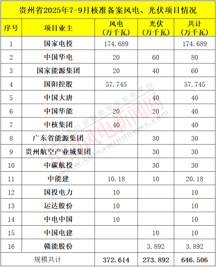 10月11日,贵州省能源局发布2025年7月-2025年9月核准备案风电光伏发电项目情况。