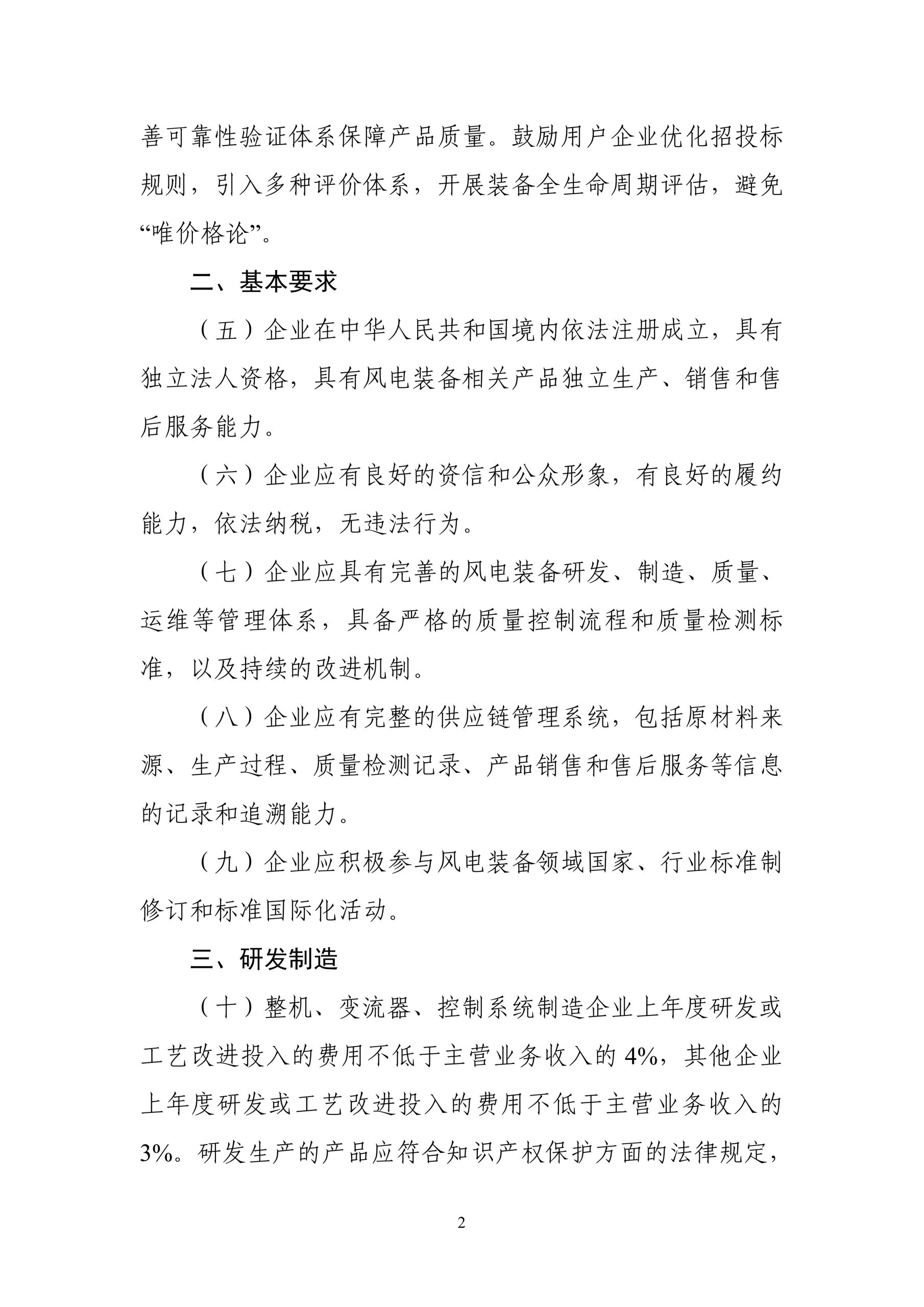 整机、变流器、控制系统制造企业上年度研发或工艺改进投入的费用不低于主营业务收入的4%,其他企业上年度研发或工艺改进投入的费用不低于主营业务收入的3%。研发生产的产品应符合知识产权保护方面的法律规定,且近三年内未出现侵权行为。