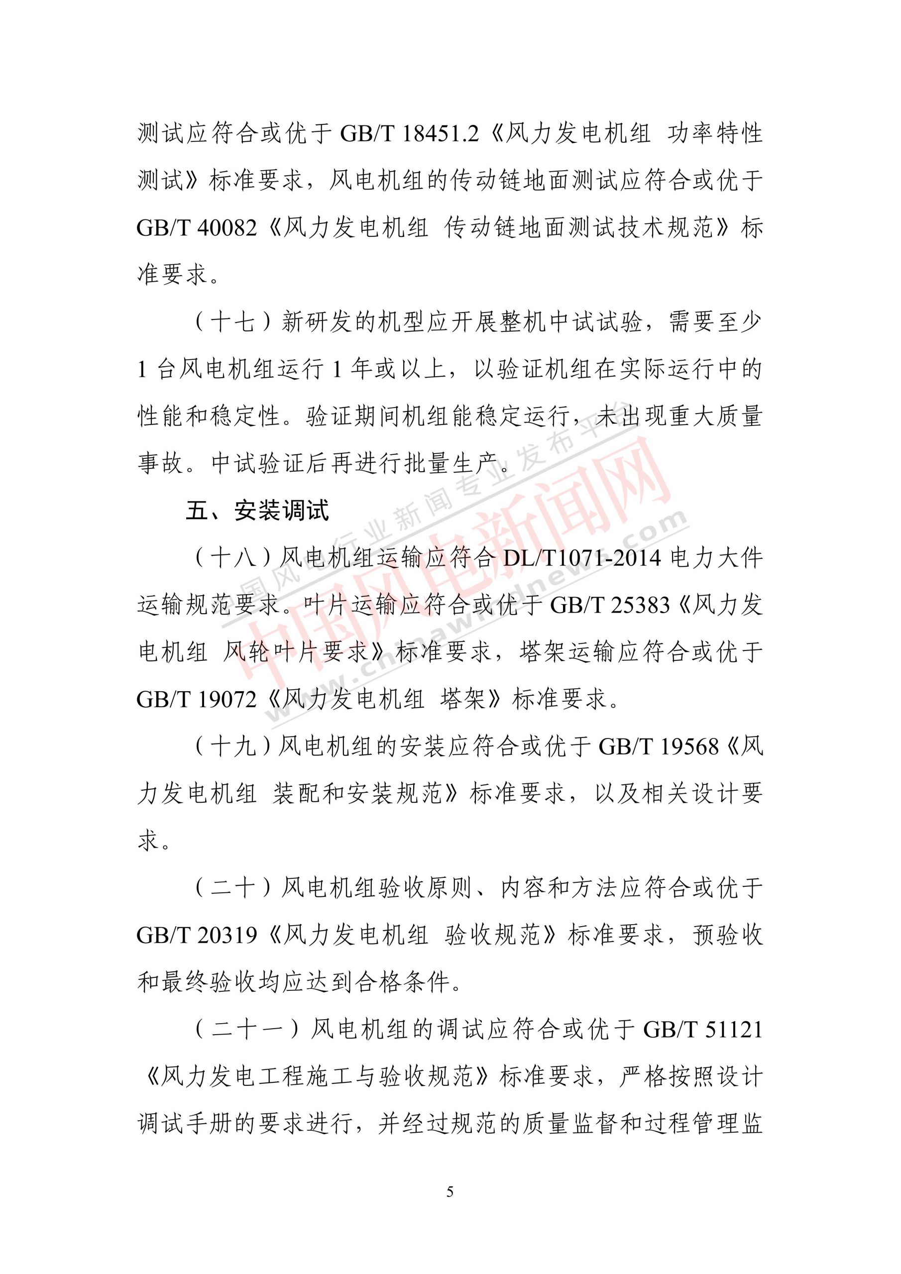 新研发的机型应开展整机中试试验,需要至少1 台风电机组运行 1 年或以上,以验证机组在实际运行中的性能和稳定性。验证期间机组能稳定运行,未出现重大质量事故。中试验证后再进行批量生产。