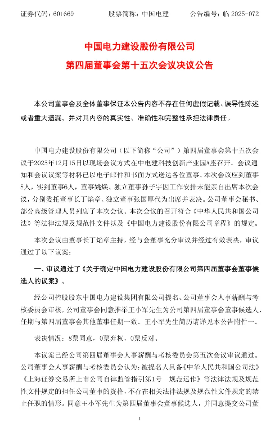 会议审议通过了《关于确定中国电力建设股份有限公司第四届董事会董事候选人的议案》。经公司控股股东中国电力建设集团有限公司提名、公司董事会人事薪酬与考核委员会审核,公司董事会同意推举王小军先生为公司第四届董事会董事候选人,任期与第四届董事会其他董事任期一致。