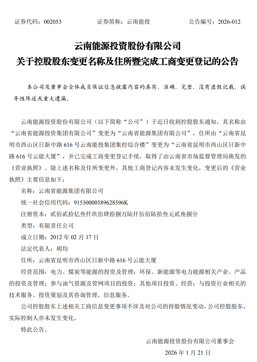 1月20日,云南能投发布公告称,公司于近日收到控股股东通知,其名称由“云南省能源投资集团有限公司”变更为“云南省能源集团有限公司”,住所由“云南省昆明市西山区日新中路616号云南能投集团集控综合楼”变更为“云南省昆明市西山区日新中路616号云能大厦”,并已完成工商变更登记手续,取得了由云南省市场监督管理局换发的《营业执照》。