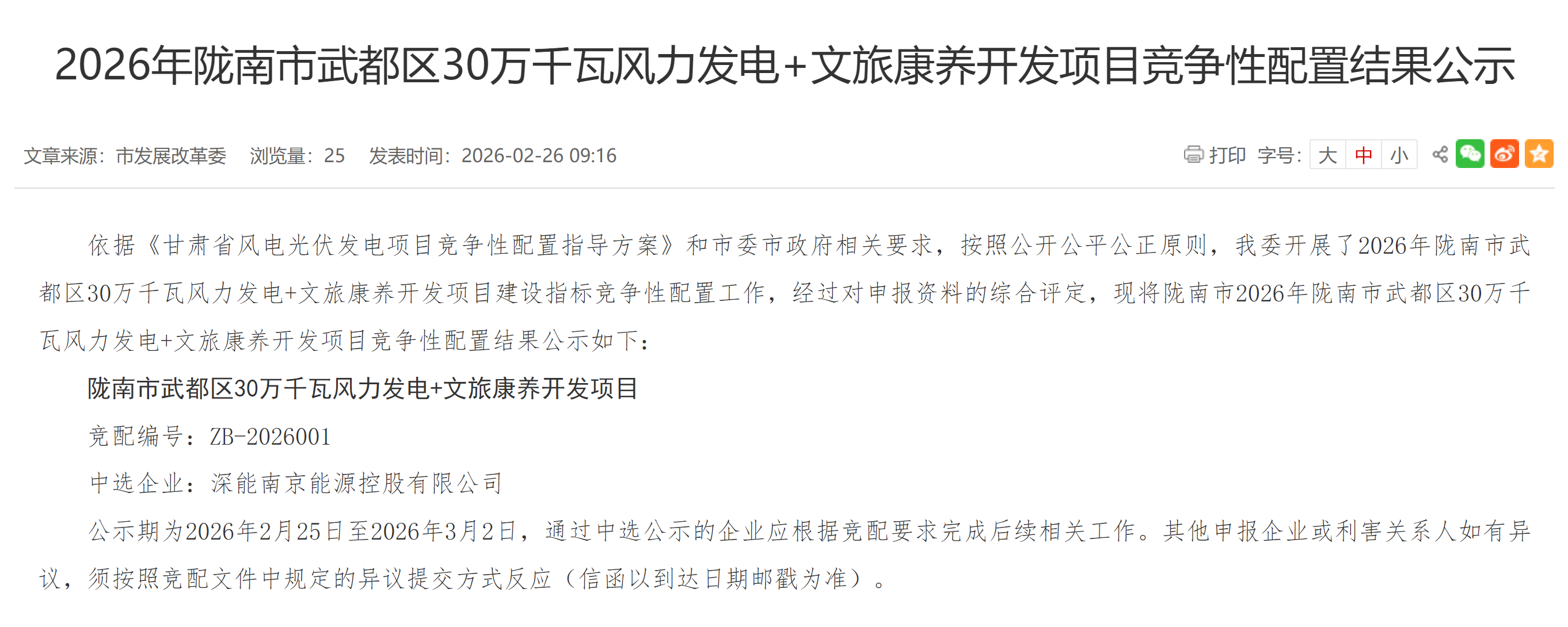 2026年陇南市武都区30万千瓦风力发电+文旅康养开发项目竞争性配置结果公示