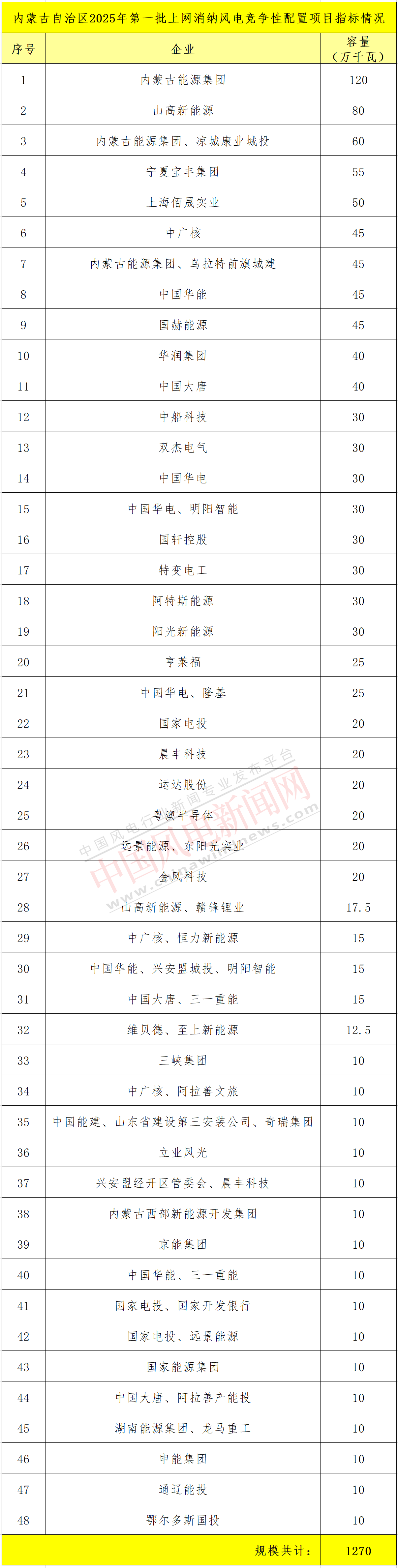 12.7GW!内蒙古自治区2025年第一批上网消纳风电竞争性配置项目清单